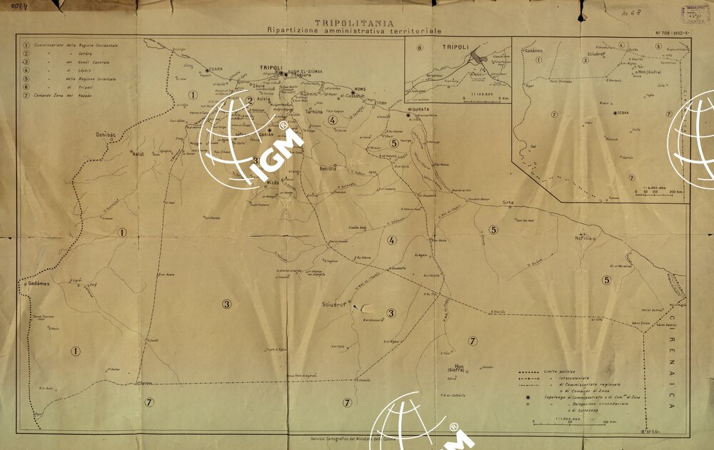 Carta in foglio unico mostrante i limiti politici, intercoloniali, di commissariato regionale o di comando di zona, capoluoghi di commissariato o di comando di zona, di delgazione circondariale, di sottozona. In alto cartine sussidiarie per la zona di Tripoli (1:100.000) e la zona del Fezzan (1:4.000.000). Servizio Cartografico del Ministero della Guerra.