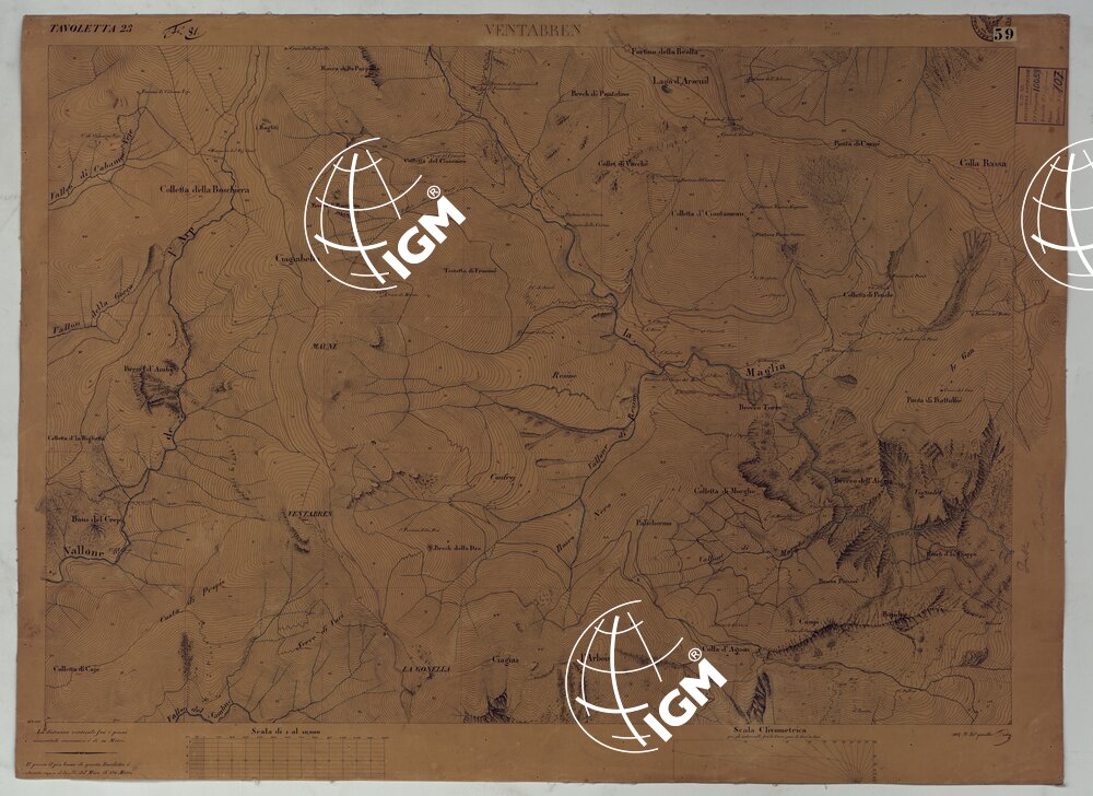 Rilievo regolare in 99 tavolette (minute di campagna) del territorio della Contea di Nizza. Il rilievo è dimostrato a curve orizzontali, tracciate all’equidistanza di 10 metri. Gli operatori furono ufficiali di armi diverse, probabilmente allievi della Scuola di S. M. : Avet, Albert, Borson, Basso, Bergalli, Costanze, Cordon, Ceva, Colli, Carderina, Cordero, Coda, Di Pralormo, Dal Pozzo, De Fornari, De Candia, D’Angennes, Escoffier, Federici, Falicon, Govone, La Grange, La Fleche, Muletti, Marazzano, Mazè, Morozzo, Mariani, Pictet, Ponzani, Piola Caselle, Righini, Rinaudo, Ricci, S. Andrea, Somis, Villamarina.