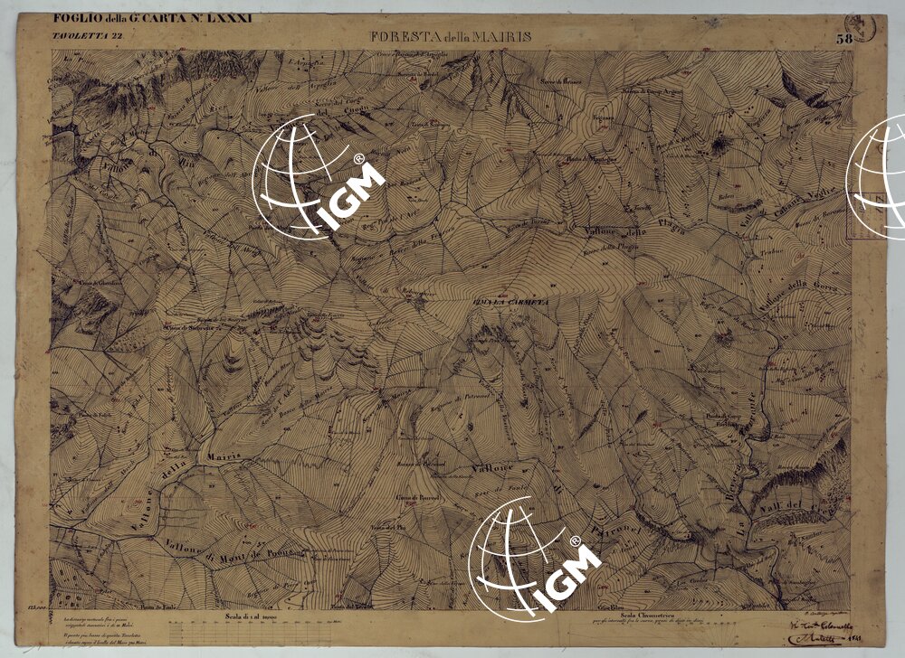 Rilievo regolare in 99 tavolette (minute di campagna) del territorio della Contea di Nizza. Il rilievo è dimostrato a curve orizzontali, tracciate all’equidistanza di 10 metri. Gli operatori furono ufficiali di armi diverse, probabilmente allievi della Scuola di S. M. : Avet, Albert, Borson, Basso, Bergalli, Costanze, Cordon, Ceva, Colli, Carderina, Cordero, Coda, Di Pralormo, Dal Pozzo, De Fornari, De Candia, D’Angennes, Escoffier, Federici, Falicon, Govone, La Grange, La Fleche, Muletti, Marazzano, Mazè, Morozzo, Mariani, Pictet, Ponzani, Piola Caselle, Righini, Rinaudo, Ricci, S. Andrea, Somis, Villamarina.
