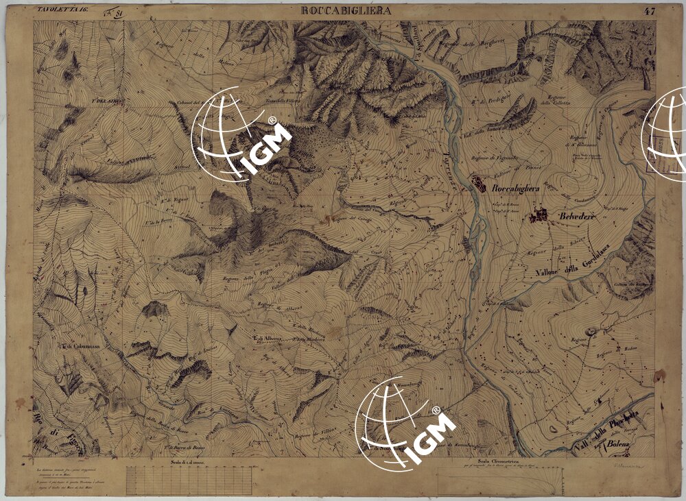 Rilievo regolare in 99 tavolette (minute di campagna) del territorio della Contea di Nizza. Il rilievo è dimostrato a curve orizzontali, tracciate all’equidistanza di 10 metri. Gli operatori furono ufficiali di armi diverse, probabilmente allievi della Scuola di S. M. : Avet, Albert, Borson, Basso, Bergalli, Costanze, Cordon, Ceva, Colli, Carderina, Cordero, Coda, Di Pralormo, Dal Pozzo, De Fornari, De Candia, D’Angennes, Escoffier, Federici, Falicon, Govone, La Grange, La Fleche, Muletti, Marazzano, Mazè, Morozzo, Mariani, Pictet, Ponzani, Piola Caselle, Righini, Rinaudo, Ricci, S. Andrea, Somis, Villamarina.