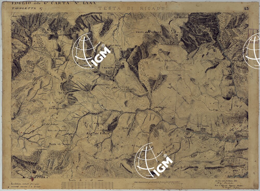 Rilievo regolare in 99 tavolette (minute di campagna) del territorio della Contea di Nizza. Il rilievo è dimostrato a curve orizzontali, tracciate all’equidistanza di 10 metri. Gli operatori furono ufficiali di armi diverse, probabilmente allievi della Scuola di S. M. : Avet, Albert, Borson, Basso, Bergalli, Costanze, Cordon, Ceva, Colli, Carderina, Cordero, Coda, Di Pralormo, Dal Pozzo, De Fornari, De Candia, D’Angennes, Escoffier, Federici, Falicon, Govone, La Grange, La Fleche, Muletti, Marazzano, Mazè, Morozzo, Mariani, Pictet, Ponzani, Piola Caselle, Righini, Rinaudo, Ricci, S. Andrea, Somis, Villamarina.