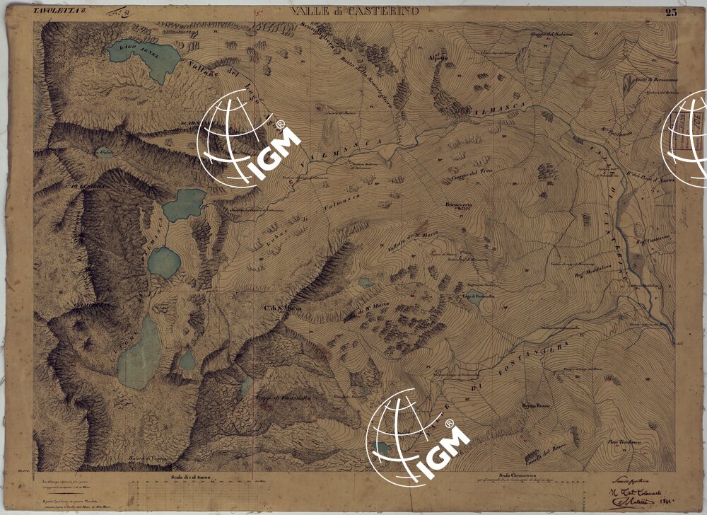 Rilievo regolare in 99 tavolette (minute di campagna) del territorio della Contea di Nizza. Il rilievo è dimostrato a curve orizzontali, tracciate all’equidistanza di 10 metri. Gli operatori furono ufficiali di armi diverse, probabilmente allievi della Scuola di S. M. : Avet, Albert, Borson, Basso, Bergalli, Costanze, Cordon, Ceva, Colli, Carderina, Cordero, Coda, Di Pralormo, Dal Pozzo, De Fornari, De Candia, D’Angennes, Escoffier, Federici, Falicon, Govone, La Grange, La Fleche, Muletti, Marazzano, Mazè, Morozzo, Mariani, Pictet, Ponzani, Piola Caselle, Righini, Rinaudo, Ricci, S. Andrea, Somis, Villamarina.