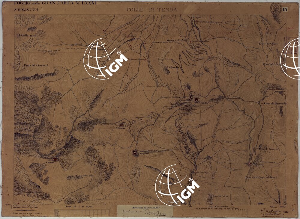 Rilievo regolare in 99 tavolette (minute di campagna) del territorio della Contea di Nizza. Il rilievo è dimostrato a curve orizzontali, tracciate all’equidistanza di 10 metri. Gli operatori furono ufficiali di armi diverse, probabilmente allievi della Scuola di S. M. : Avet, Albert, Borson, Basso, Bergalli, Costanze, Cordon, Ceva, Colli, Carderina, Cordero, Coda, Di Pralormo, Dal Pozzo, De Fornari, De Candia, D’Angennes, Escoffier, Federici, Falicon, Govone, La Grange, La Fleche, Muletti, Marazzano, Mazè, Morozzo, Mariani, Pictet, Ponzani, Piola Caselle, Righini, Rinaudo, Ricci, S. Andrea, Somis, Villamarina.