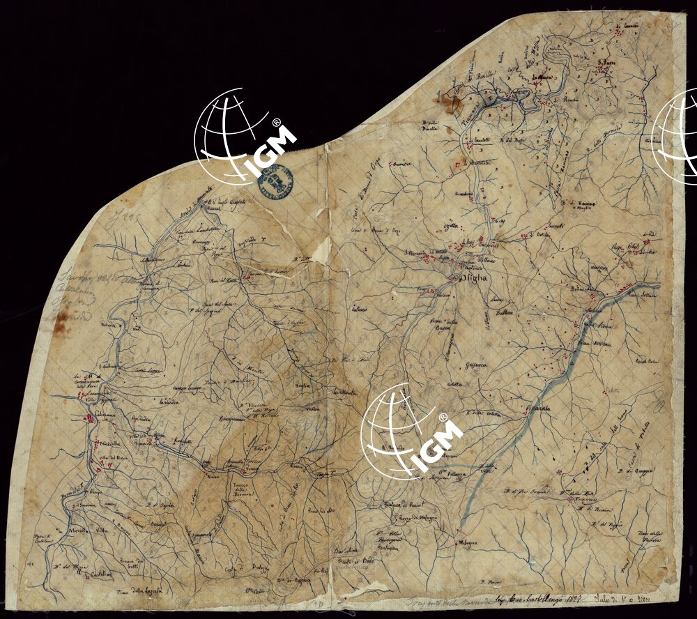 Il titolo non è presente sulla carta. Quattro minute di campagna, delle ricognizioni eseguite nel 1827 dal Cap. Cav. Castellengo nel territorio della Provincia di Savona. Quattro fogli montati su tela.