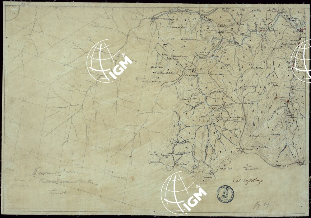 Il titolo non è presente sulla carta. Quattro minute di campagna, delle ricognizioni eseguite nel 1827 dal Cap. Cav. Castellengo nel territorio della Provincia di Savona. Quattro fogli montati su tela.