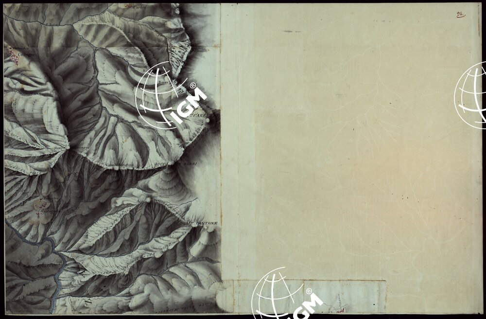 Gruppo di 100 minute di campagna dei rilevamenti eseguiti negli anni 1816-27 dagli Ufficiali del Corpo di S. M. Capitani D’Isaia Albert e Salasco, Tenenti D’Angennes, Quaglia, Roberti e Scoti, i Sottotenenti Alberti, Bergalli, Mariani, Muletti e S. Marzano. Queste minute sono tutte disegnate artisticamente ad acquerello: rappresentano l’orografia con lo sfumo a luce obliqua, gli abitati in rosso, le acque in azzurro, vegetazioni e colture in verde, strade in nero.