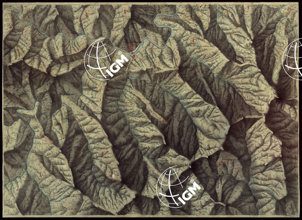 Gruppo di 100 minute di campagna dei rilevamenti eseguiti negli anni 1816-27 dagli Ufficiali del Corpo di S. M. Capitani D’Isaia Albert e Salasco, Tenenti D’Angennes, Quaglia, Roberti e Scoti, i Sottotenenti Alberti, Bergalli, Mariani, Muletti e S. Marzano. Queste minute sono tutte disegnate artisticamente ad acquerello: rappresentano l’orografia con lo sfumo a luce obliqua, gli abitati in rosso, le acque in azzurro, vegetazioni e colture in verde, strade in nero.