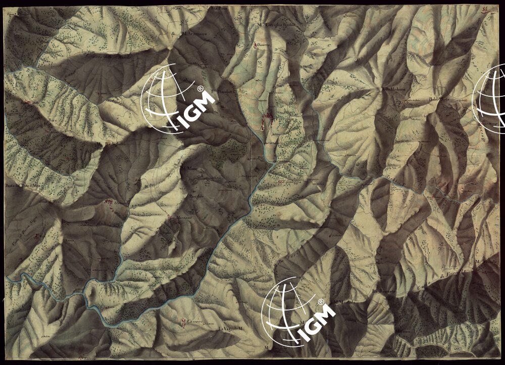 Gruppo di 100 minute di campagna dei rilevamenti eseguiti negli anni 1816-27 dagli Ufficiali del Corpo di S. M. Capitani D’Isaia Albert e Salasco, Tenenti D’Angennes, Quaglia, Roberti e Scoti, i Sottotenenti Alberti, Bergalli, Mariani, Muletti e S. Marzano. Queste minute sono tutte disegnate artisticamente ad acquerello: rappresentano l’orografia con lo sfumo a luce obliqua, gli abitati in rosso, le acque in azzurro, vegetazioni e colture in verde, strade in nero.