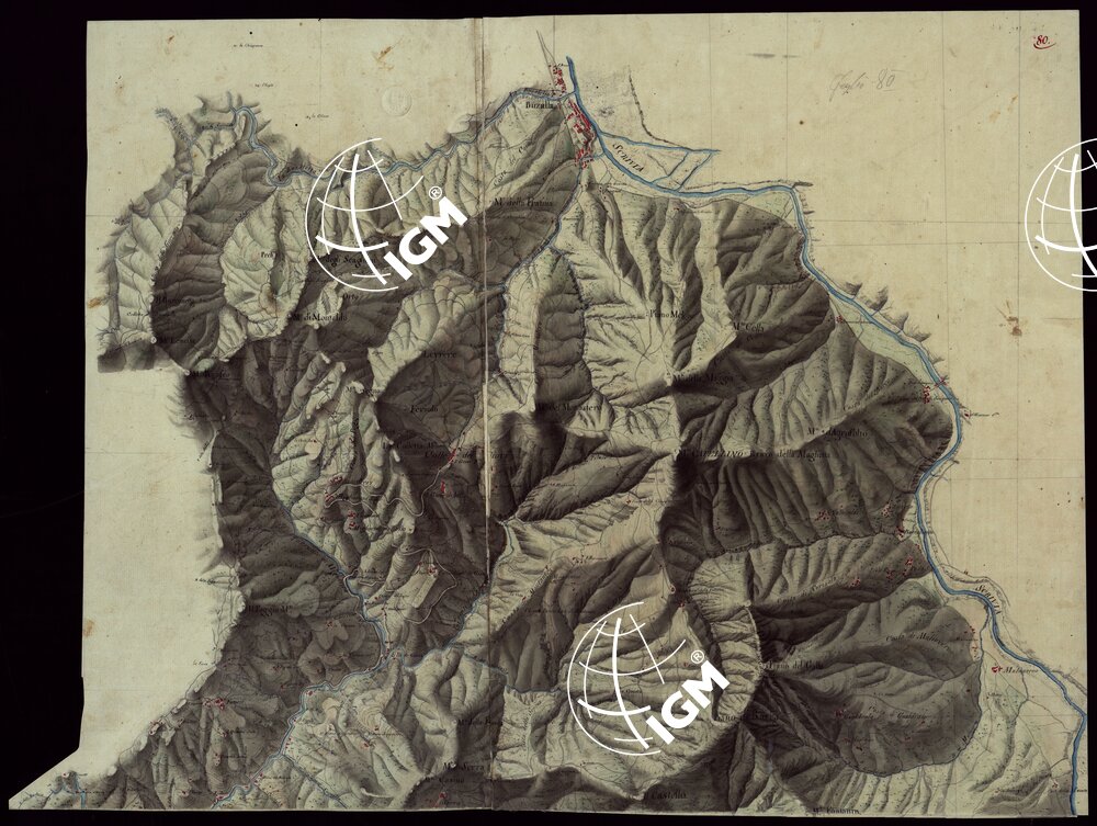 Gruppo di 100 minute di campagna dei rilevamenti eseguiti negli anni 1816-27 dagli Ufficiali del Corpo di S. M. Capitani D’Isaia Albert e Salasco, Tenenti D’Angennes, Quaglia, Roberti e Scoti, i Sottotenenti Alberti, Bergalli, Mariani, Muletti e S. Marzano. Queste minute sono tutte disegnate artisticamente ad acquerello: rappresentano l’orografia con lo sfumo a luce obliqua, gli abitati in rosso, le acque in azzurro, vegetazioni e colture in verde, strade in nero.