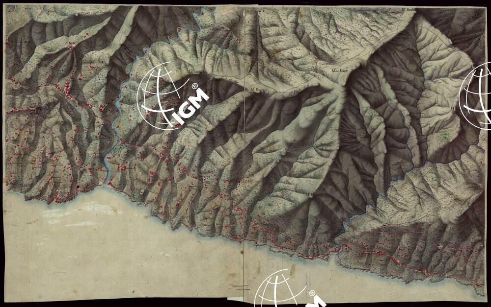 Gruppo di 100 minute di campagna dei rilevamenti eseguiti negli anni 1816-27 dagli Ufficiali del Corpo di S. M. Capitani D’Isaia Albert e Salasco, Tenenti D’Angennes, Quaglia, Roberti e Scoti, i Sottotenenti Alberti, Bergalli, Mariani, Muletti e S. Marzano. Queste minute sono tutte disegnate artisticamente ad acquerello: rappresentano l’orografia con lo sfumo a luce obliqua, gli abitati in rosso, le acque in azzurro, vegetazioni e colture in verde, strade in nero.