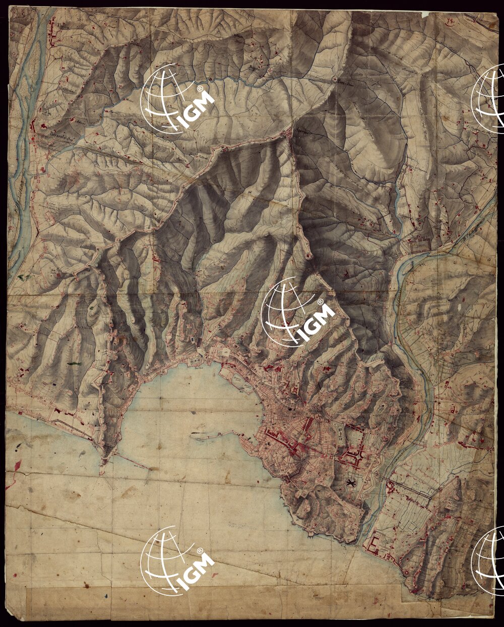 Gruppo di 100 minute di campagna dei rilevamenti eseguiti negli anni 1816-27 dagli Ufficiali del Corpo di S. M. Capitani D’Isaia Albert e Salasco, Tenenti D’Angennes, Quaglia, Roberti e Scoti, i Sottotenenti Alberti, Bergalli, Mariani, Muletti e S. Marzano. Queste minute sono tutte disegnate artisticamente ad acquerello: rappresentano l’orografia con lo sfumo a luce obliqua, gli abitati in rosso, le acque in azzurro, vegetazioni e colture in verde, strade in nero.