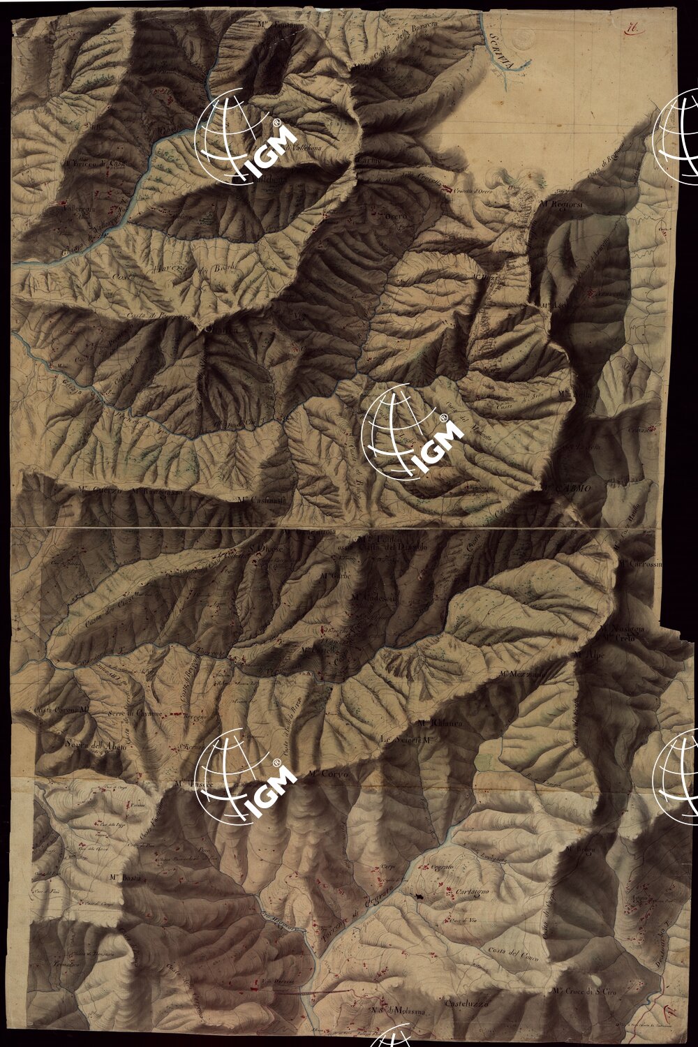Gruppo di 100 minute di campagna dei rilevamenti eseguiti negli anni 1816-27 dagli Ufficiali del Corpo di S. M. Capitani D’Isaia Albert e Salasco, Tenenti D’Angennes, Quaglia, Roberti e Scoti, i Sottotenenti Alberti, Bergalli, Mariani, Muletti e S. Marzano. Queste minute sono tutte disegnate artisticamente ad acquerello: rappresentano l’orografia con lo sfumo a luce obliqua, gli abitati in rosso, le acque in azzurro, vegetazioni e colture in verde, strade in nero.