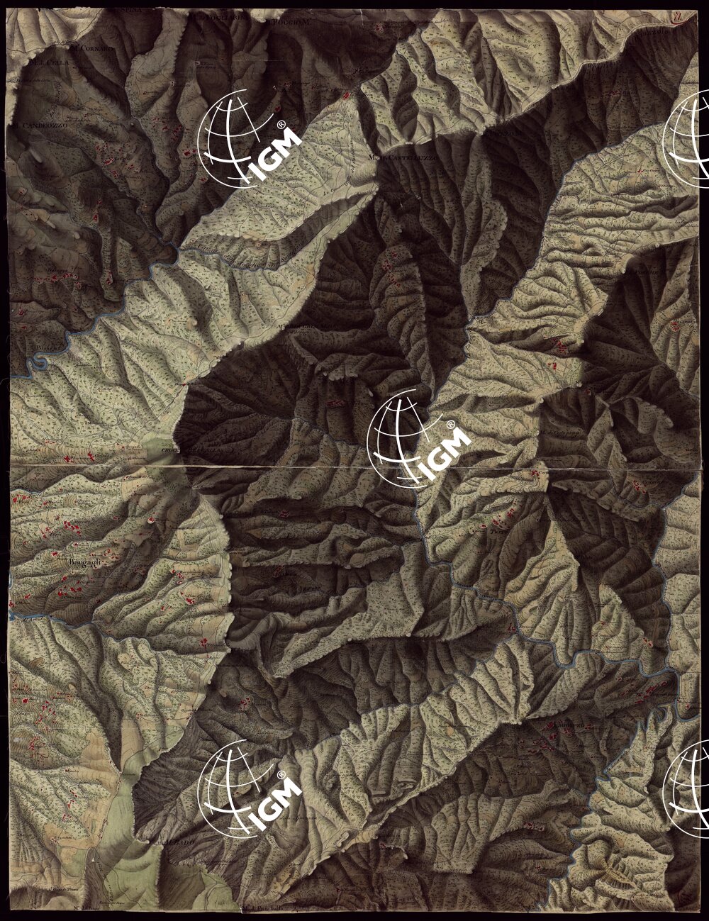 Gruppo di 100 minute di campagna dei rilevamenti eseguiti negli anni 1816-27 dagli Ufficiali del Corpo di S. M. Capitani D’Isaia Albert e Salasco, Tenenti D’Angennes, Quaglia, Roberti e Scoti, i Sottotenenti Alberti, Bergalli, Mariani, Muletti e S. Marzano. Queste minute sono tutte disegnate artisticamente ad acquerello: rappresentano l’orografia con lo sfumo a luce obliqua, gli abitati in rosso, le acque in azzurro, vegetazioni e colture in verde, strade in nero.