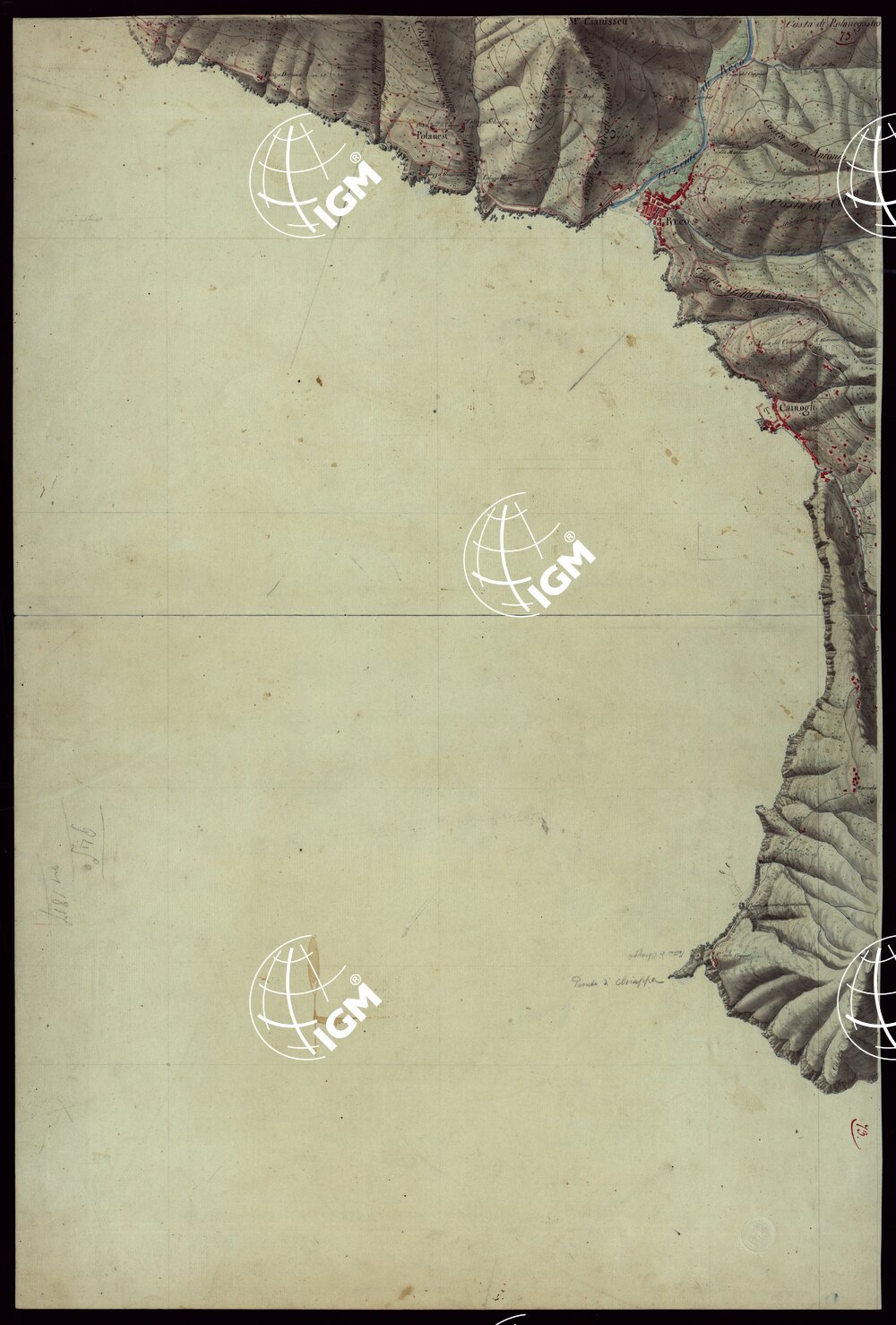 Gruppo di 100 minute di campagna dei rilevamenti eseguiti negli anni 1816-27 dagli Ufficiali del Corpo di S. M. Capitani D’Isaia Albert e Salasco, Tenenti D’Angennes, Quaglia, Roberti e Scoti, i Sottotenenti Alberti, Bergalli, Mariani, Muletti e S. Marzano. Queste minute sono tutte disegnate artisticamente ad acquerello: rappresentano l’orografia con lo sfumo a luce obliqua, gli abitati in rosso, le acque in azzurro, vegetazioni e colture in verde, strade in nero.
