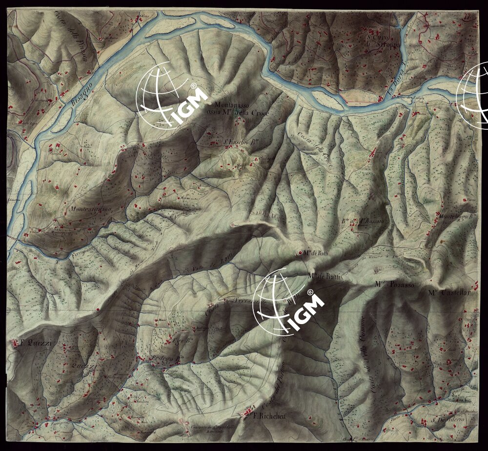 Gruppo di 100 minute di campagna dei rilevamenti eseguiti negli anni 1816-27 dagli Ufficiali del Corpo di S. M. Capitani D’Isaia Albert e Salasco, Tenenti D’Angennes, Quaglia, Roberti e Scoti, i Sottotenenti Alberti, Bergalli, Mariani, Muletti e S. Marzano. Queste minute sono tutte disegnate artisticamente ad acquerello: rappresentano l’orografia con lo sfumo a luce obliqua, gli abitati in rosso, le acque in azzurro, vegetazioni e colture in verde, strade in nero.