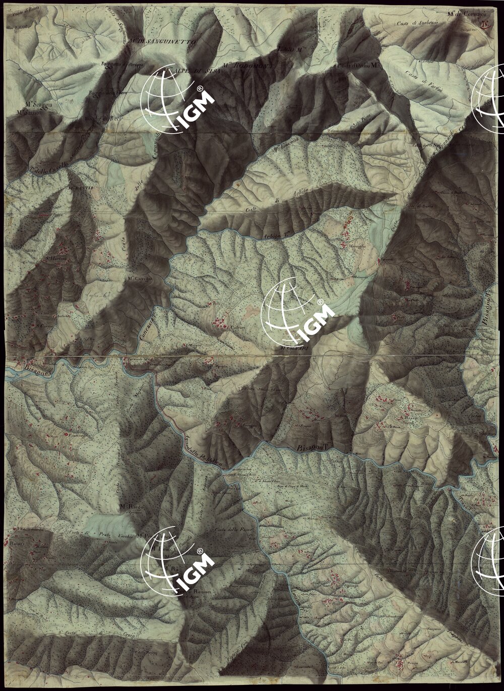 Gruppo di 100 minute di campagna dei rilevamenti eseguiti negli anni 1816-27 dagli Ufficiali del Corpo di S. M. Capitani D’Isaia Albert e Salasco, Tenenti D’Angennes, Quaglia, Roberti e Scoti, i Sottotenenti Alberti, Bergalli, Mariani, Muletti e S. Marzano. Queste minute sono tutte disegnate artisticamente ad acquerello: rappresentano l’orografia con lo sfumo a luce obliqua, gli abitati in rosso, le acque in azzurro, vegetazioni e colture in verde, strade in nero.