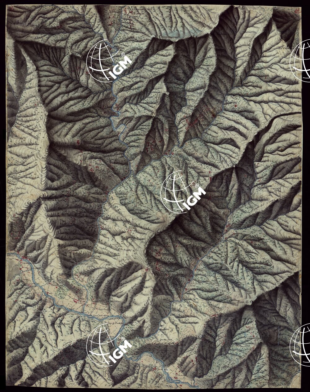 Gruppo di 100 minute di campagna dei rilevamenti eseguiti negli anni 1816-27 dagli Ufficiali del Corpo di S. M. Capitani D’Isaia Albert e Salasco, Tenenti D’Angennes, Quaglia, Roberti e Scoti, i Sottotenenti Alberti, Bergalli, Mariani, Muletti e S. Marzano. Queste minute sono tutte disegnate artisticamente ad acquerello: rappresentano l’orografia con lo sfumo a luce obliqua, gli abitati in rosso, le acque in azzurro, vegetazioni e colture in verde, strade in nero.