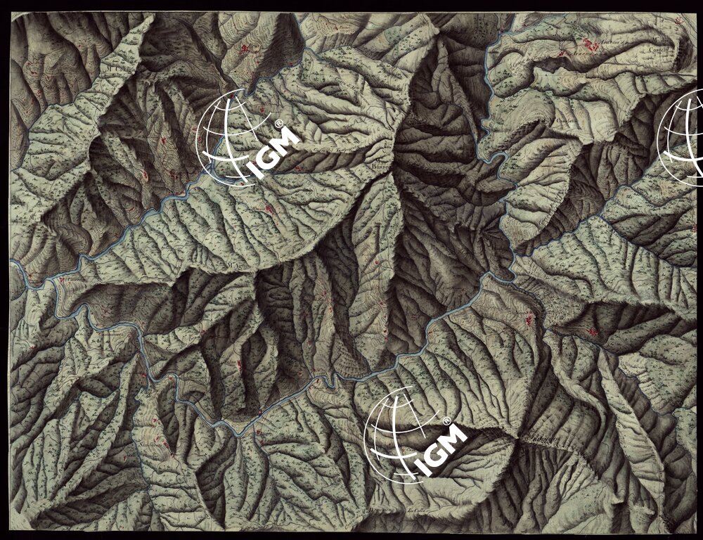 Gruppo di 100 minute di campagna dei rilevamenti eseguiti negli anni 1816-27 dagli Ufficiali del Corpo di S. M. Capitani D’Isaia Albert e Salasco, Tenenti D’Angennes, Quaglia, Roberti e Scoti, i Sottotenenti Alberti, Bergalli, Mariani, Muletti e S. Marzano. Queste minute sono tutte disegnate artisticamente ad acquerello: rappresentano l’orografia con lo sfumo a luce obliqua, gli abitati in rosso, le acque in azzurro, vegetazioni e colture in verde, strade in nero.
