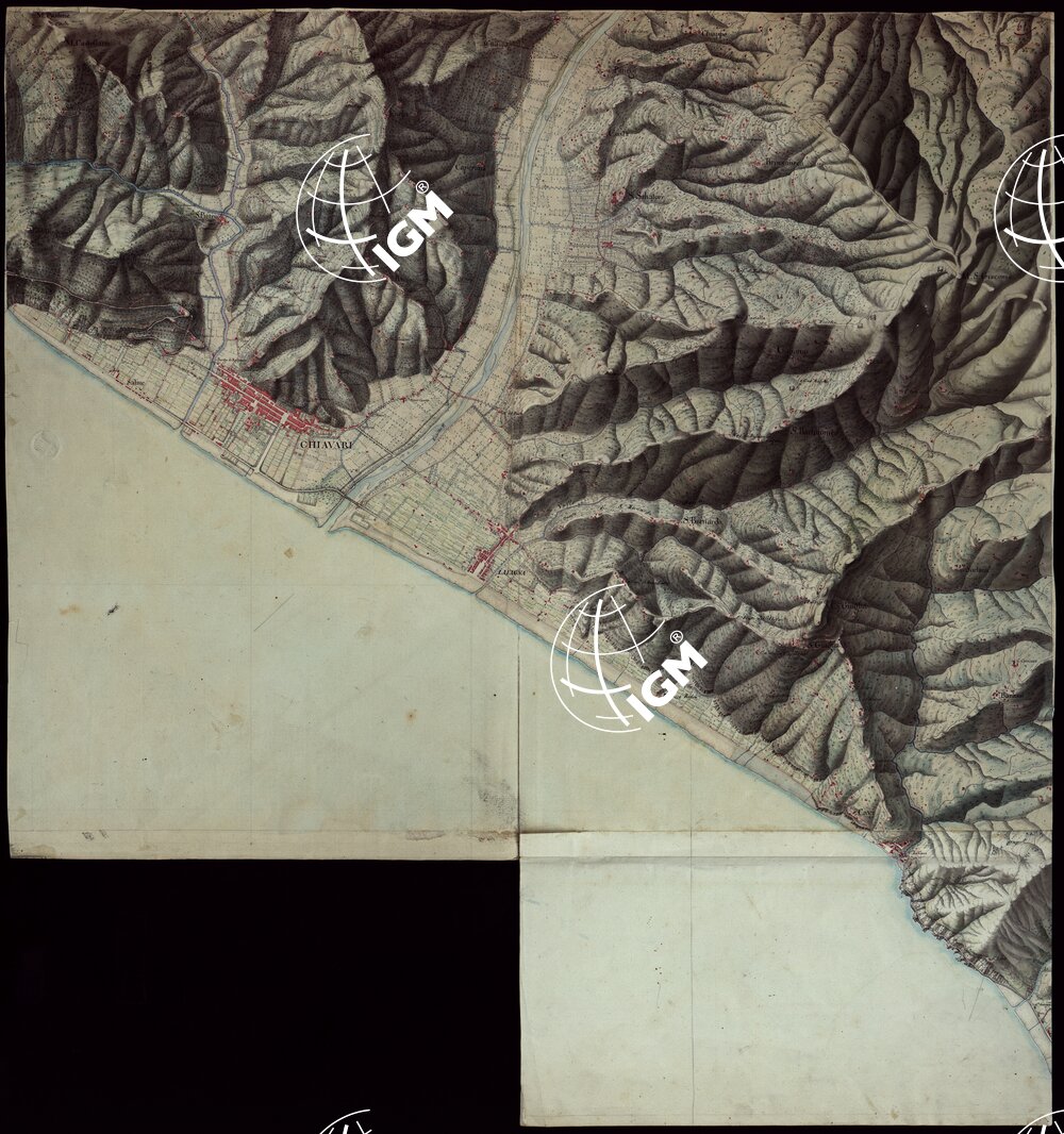 Gruppo di 100 minute di campagna dei rilevamenti eseguiti negli anni 1816-27 dagli Ufficiali del Corpo di S. M. Capitani D’Isaia Albert e Salasco, Tenenti D’Angennes, Quaglia, Roberti e Scoti, i Sottotenenti Alberti, Bergalli, Mariani, Muletti e S. Marzano. Queste minute sono tutte disegnate artisticamente ad acquerello: rappresentano l’orografia con lo sfumo a luce obliqua, gli abitati in rosso, le acque in azzurro, vegetazioni e colture in verde, strade in nero.