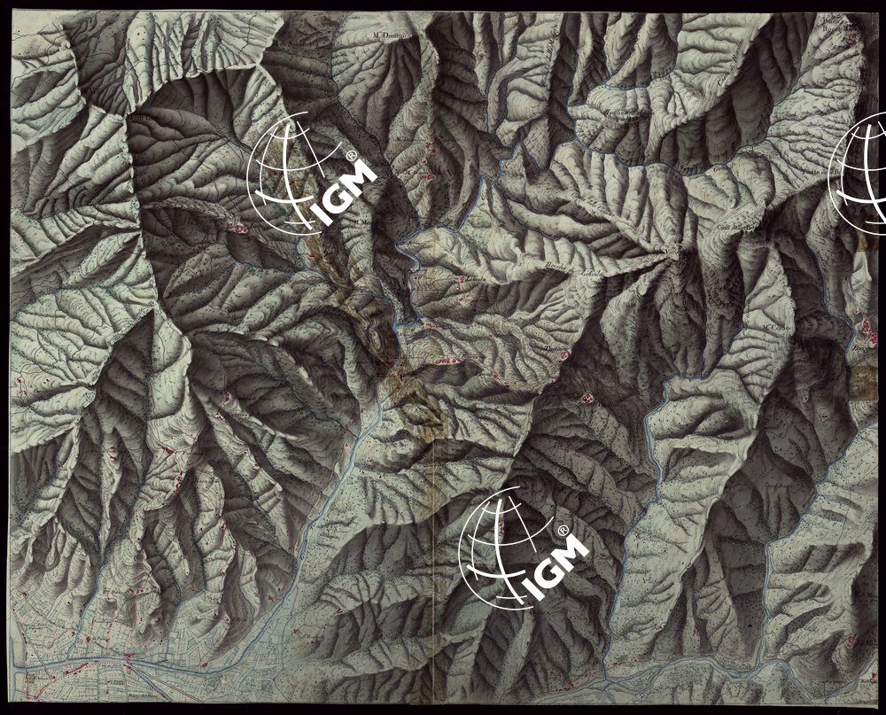 Gruppo di 100 minute di campagna dei rilevamenti eseguiti negli anni 1816-27 dagli Ufficiali del Corpo di S. M. Capitani D’Isaia Albert e Salasco, Tenenti D’Angennes, Quaglia, Roberti e Scoti, i Sottotenenti Alberti, Bergalli, Mariani, Muletti e S. Marzano. Queste minute sono tutte disegnate artisticamente ad acquerello: rappresentano l’orografia con lo sfumo a luce obliqua, gli abitati in rosso, le acque in azzurro, vegetazioni e colture in verde, strade in nero.