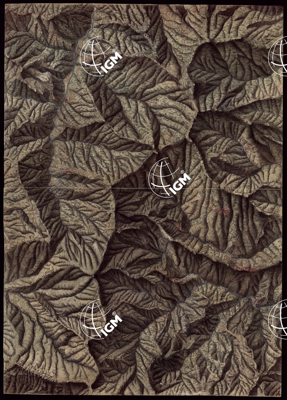 Gruppo di 100 minute di campagna dei rilevamenti eseguiti negli anni 1816-27 dagli Ufficiali del Corpo di S. M. Capitani D’Isaia Albert e Salasco, Tenenti D’Angennes, Quaglia, Roberti e Scoti, i Sottotenenti Alberti, Bergalli, Mariani, Muletti e S. Marzano. Queste minute sono tutte disegnate artisticamente ad acquerello: rappresentano l’orografia con lo sfumo a luce obliqua, gli abitati in rosso, le acque in azzurro, vegetazioni e colture in verde, strade in nero.