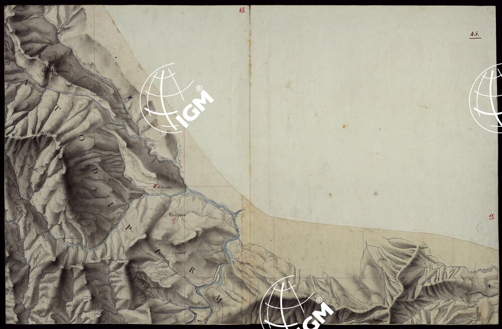 Gruppo di 100 minute di campagna dei rilevamenti eseguiti negli anni 1816-27 dagli Ufficiali del Corpo di S. M. Capitani D’Isaia Albert e Salasco, Tenenti D’Angennes, Quaglia, Roberti e Scoti, i Sottotenenti Alberti, Bergalli, Mariani, Muletti e S. Marzano. Queste minute sono tutte disegnate artisticamente ad acquerello: rappresentano l’orografia con lo sfumo a luce obliqua, gli abitati in rosso, le acque in azzurro, vegetazioni e colture in verde, strade in nero.