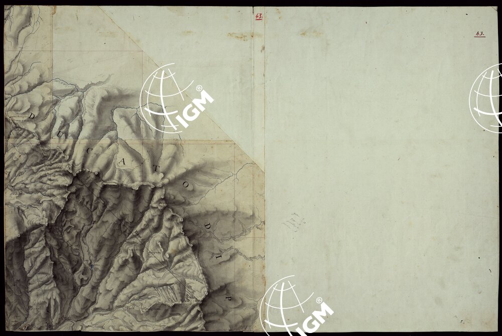 Gruppo di 100 minute di campagna dei rilevamenti eseguiti negli anni 1816-27 dagli Ufficiali del Corpo di S. M. Capitani D’Isaia Albert e Salasco, Tenenti D’Angennes, Quaglia, Roberti e Scoti, i Sottotenenti Alberti, Bergalli, Mariani, Muletti e S. Marzano. Queste minute sono tutte disegnate artisticamente ad acquerello: rappresentano l’orografia con lo sfumo a luce obliqua, gli abitati in rosso, le acque in azzurro, vegetazioni e colture in verde, strade in nero.