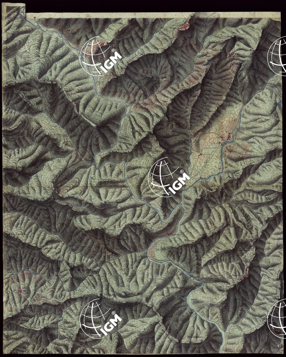 Gruppo di 100 minute di campagna dei rilevamenti eseguiti negli anni 1816-27 dagli Ufficiali del Corpo di S. M. Capitani D’Isaia Albert e Salasco, Tenenti D’Angennes, Quaglia, Roberti e Scoti, i Sottotenenti Alberti, Bergalli, Mariani, Muletti e S. Marzano. Queste minute sono tutte disegnate artisticamente ad acquerello: rappresentano l’orografia con lo sfumo a luce obliqua, gli abitati in rosso, le acque in azzurro, vegetazioni e colture in verde, strade in nero.