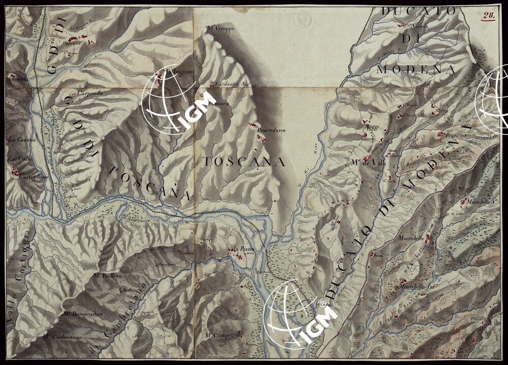 Gruppo di 100 minute di campagna dei rilevamenti eseguiti negli anni 1816-27 dagli Ufficiali del Corpo di S. M. Capitani D’Isaia Albert e Salasco, Tenenti D’Angennes, Quaglia, Roberti e Scoti, i Sottotenenti Alberti, Bergalli, Mariani, Muletti e S. Marzano. Queste minute sono tutte disegnate artisticamente ad acquerello: rappresentano l’orografia con lo sfumo a luce obliqua, gli abitati in rosso, le acque in azzurro, vegetazioni e colture in verde, strade in nero.
