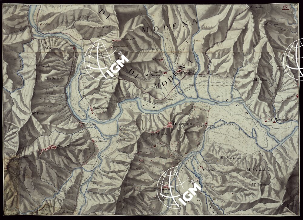 Gruppo di 100 minute di campagna dei rilevamenti eseguiti negli anni 1816-27 dagli Ufficiali del Corpo di S. M. Capitani D’Isaia Albert e Salasco, Tenenti D’Angennes, Quaglia, Roberti e Scoti, i Sottotenenti Alberti, Bergalli, Mariani, Muletti e S. Marzano. Queste minute sono tutte disegnate artisticamente ad acquerello: rappresentano l’orografia con lo sfumo a luce obliqua, gli abitati in rosso, le acque in azzurro, vegetazioni e colture in verde, strade in nero.