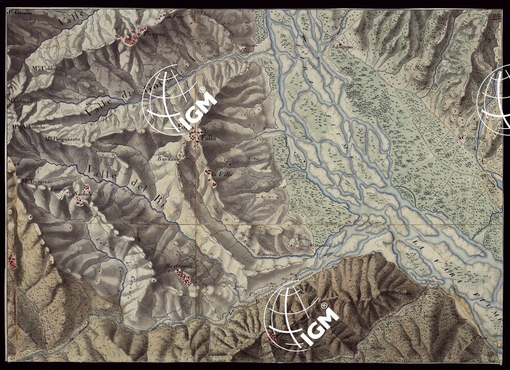 Gruppo di 100 minute di campagna dei rilevamenti eseguiti negli anni 1816-27 dagli Ufficiali del Corpo di S. M. Capitani D’Isaia Albert e Salasco, Tenenti D’Angennes, Quaglia, Roberti e Scoti, i Sottotenenti Alberti, Bergalli, Mariani, Muletti e S. Marzano. Queste minute sono tutte disegnate artisticamente ad acquerello: rappresentano l’orografia con lo sfumo a luce obliqua, gli abitati in rosso, le acque in azzurro, vegetazioni e colture in verde, strade in nero.