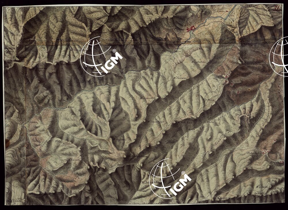 Gruppo di 100 minute di campagna dei rilevamenti eseguiti negli anni 1816-27 dagli Ufficiali del Corpo di S. M. Capitani D’Isaia Albert e Salasco, Tenenti D’Angennes, Quaglia, Roberti e Scoti, i Sottotenenti Alberti, Bergalli, Mariani, Muletti e S. Marzano. Queste minute sono tutte disegnate artisticamente ad acquerello: rappresentano l’orografia con lo sfumo a luce obliqua, gli abitati in rosso, le acque in azzurro, vegetazioni e colture in verde, strade in nero.