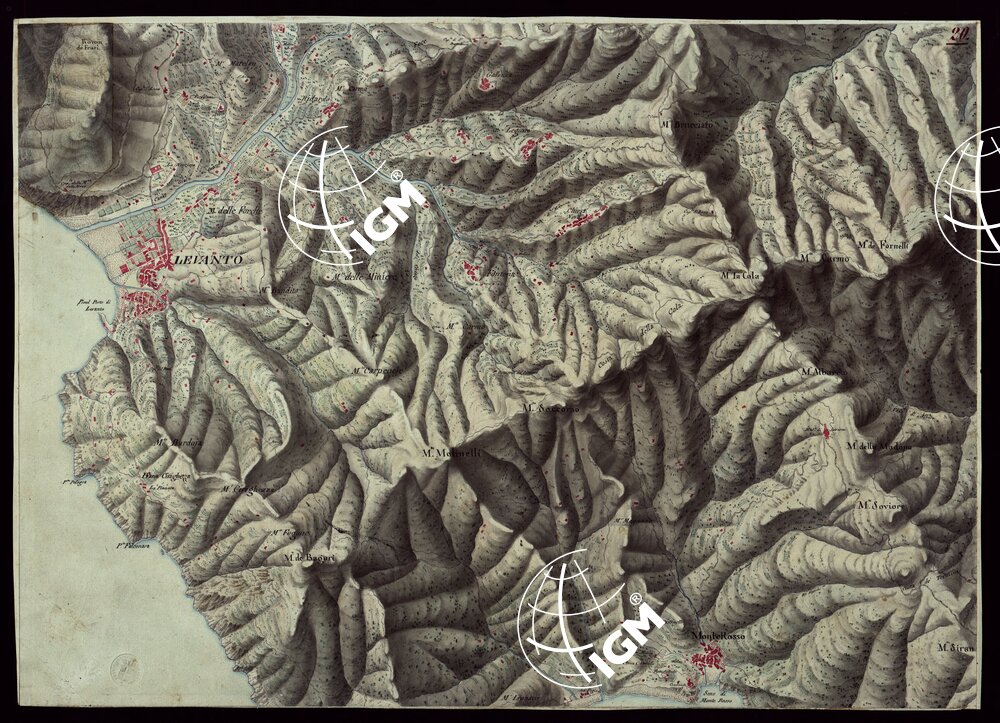 Gruppo di 100 minute di campagna dei rilevamenti eseguiti negli anni 1816-27 dagli Ufficiali del Corpo di S. M. Capitani D’Isaia Albert e Salasco, Tenenti D’Angennes, Quaglia, Roberti e Scoti, i Sottotenenti Alberti, Bergalli, Mariani, Muletti e S. Marzano. Queste minute sono tutte disegnate artisticamente ad acquerello: rappresentano l’orografia con lo sfumo a luce obliqua, gli abitati in rosso, le acque in azzurro, vegetazioni e colture in verde, strade in nero.