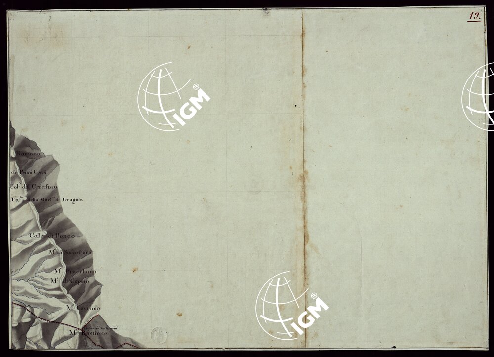 Gruppo di 100 minute di campagna dei rilevamenti eseguiti negli anni 1816-27 dagli Ufficiali del Corpo di S. M. Capitani D’Isaia Albert e Salasco, Tenenti D’Angennes, Quaglia, Roberti e Scoti, i Sottotenenti Alberti, Bergalli, Mariani, Muletti e S. Marzano. Queste minute sono tutte disegnate artisticamente ad acquerello: rappresentano l’orografia con lo sfumo a luce obliqua, gli abitati in rosso, le acque in azzurro, vegetazioni e colture in verde, strade in nero.
