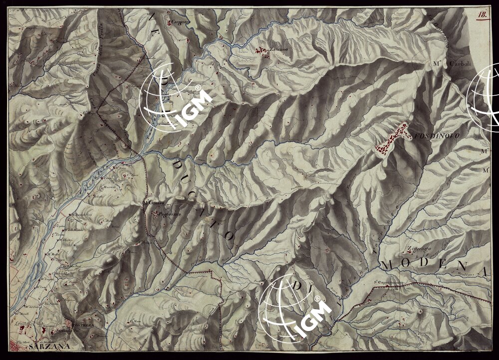 Gruppo di 100 minute di campagna dei rilevamenti eseguiti negli anni 1816-27 dagli Ufficiali del Corpo di S. M. Capitani D’Isaia Albert e Salasco, Tenenti D’Angennes, Quaglia, Roberti e Scoti, i Sottotenenti Alberti, Bergalli, Mariani, Muletti e S. Marzano. Queste minute sono tutte disegnate artisticamente ad acquerello: rappresentano l’orografia con lo sfumo a luce obliqua, gli abitati in rosso, le acque in azzurro, vegetazioni e colture in verde, strade in nero.