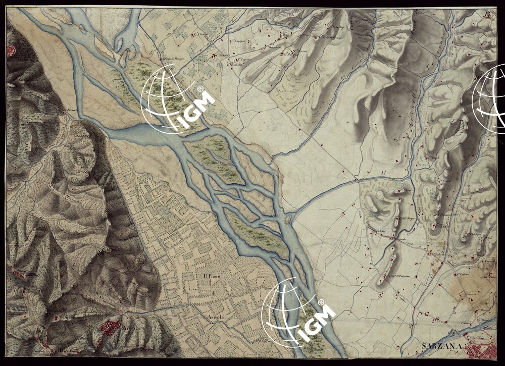 Gruppo di 100 minute di campagna dei rilevamenti eseguiti negli anni 1816-27 dagli Ufficiali del Corpo di S. M. Capitani D’Isaia Albert e Salasco, Tenenti D’Angennes, Quaglia, Roberti e Scoti, i Sottotenenti Alberti, Bergalli, Mariani, Muletti e S. Marzano. Queste minute sono tutte disegnate artisticamente ad acquerello: rappresentano l’orografia con lo sfumo a luce obliqua, gli abitati in rosso, le acque in azzurro, vegetazioni e colture in verde, strade in nero.