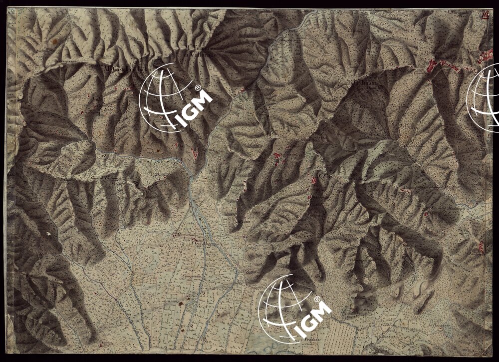 Gruppo di 100 minute di campagna dei rilevamenti eseguiti negli anni 1816-27 dagli Ufficiali del Corpo di S. M. Capitani D’Isaia Albert e Salasco, Tenenti D’Angennes, Quaglia, Roberti e Scoti, i Sottotenenti Alberti, Bergalli, Mariani, Muletti e S. Marzano. Queste minute sono tutte disegnate artisticamente ad acquerello: rappresentano l’orografia con lo sfumo a luce obliqua, gli abitati in rosso, le acque in azzurro, vegetazioni e colture in verde, strade in nero.