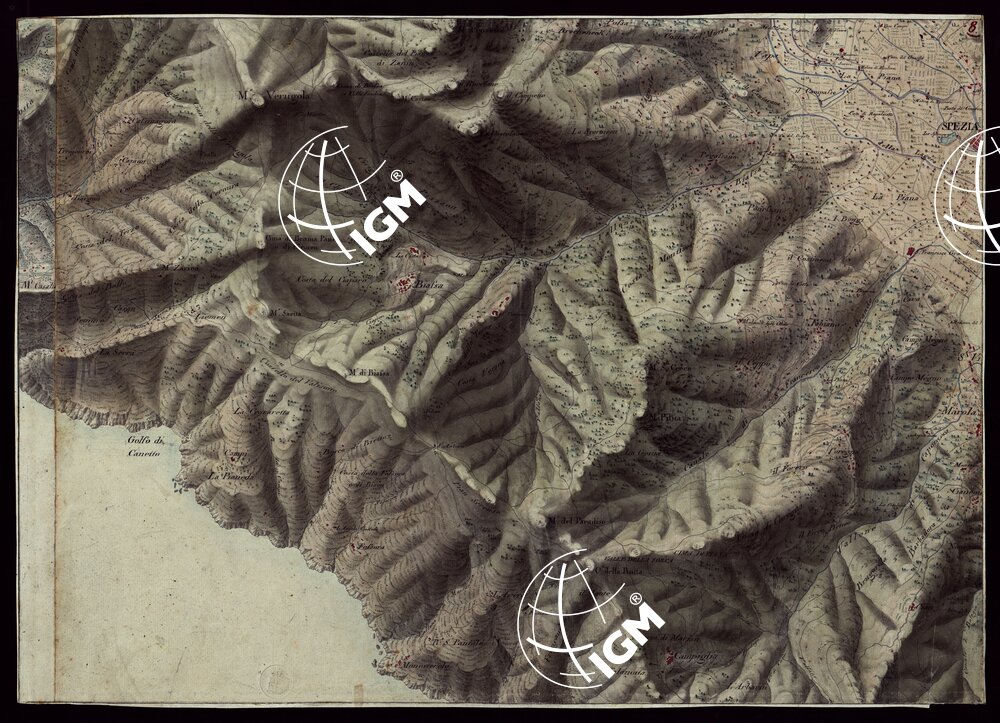Gruppo di 100 minute di campagna dei rilevamenti eseguiti negli anni 1816-27 dagli Ufficiali del Corpo di S. M. Capitani D’Isaia Albert e Salasco, Tenenti D’Angennes, Quaglia, Roberti e Scoti, i Sottotenenti Alberti, Bergalli, Mariani, Muletti e S. Marzano. Queste minute sono tutte disegnate artisticamente ad acquerello: rappresentano l’orografia con lo sfumo a luce obliqua, gli abitati in rosso, le acque in azzurro, vegetazioni e colture in verde, strade in nero.