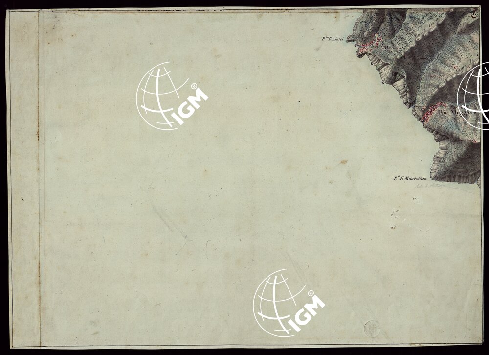 Gruppo di 100 minute di campagna dei rilevamenti eseguiti negli anni 1816-27 dagli Ufficiali del Corpo di S. M. Capitani D’Isaia Albert e Salasco, Tenenti D’Angennes, Quaglia, Roberti e Scoti, i Sottotenenti Alberti, Bergalli, Mariani, Muletti e S. Marzano. Queste minute sono tutte disegnate artisticamente ad acquerello: rappresentano l’orografia con lo sfumo a luce obliqua, gli abitati in rosso, le acque in azzurro, vegetazioni e colture in verde, strade in nero.