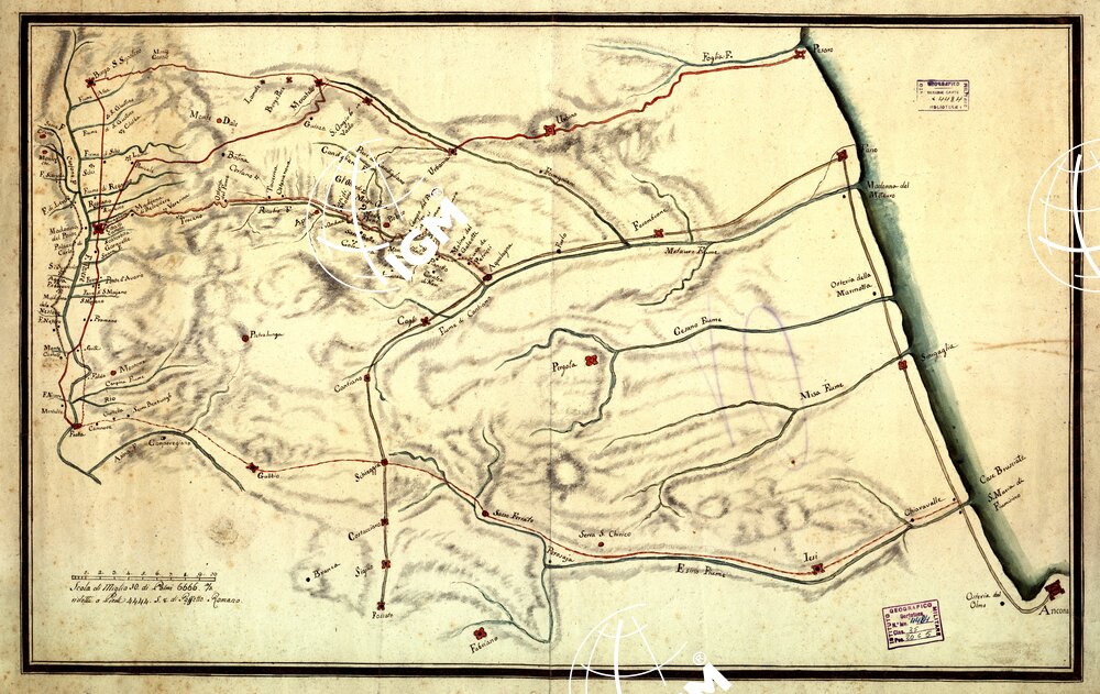 Carta manoscritta acquerellata. Corsi d’acqua in verde. Strade e abitati in rosso. Molto schematica. Scala grafica in miglia di palmi 6666. Epoca XVII sec.