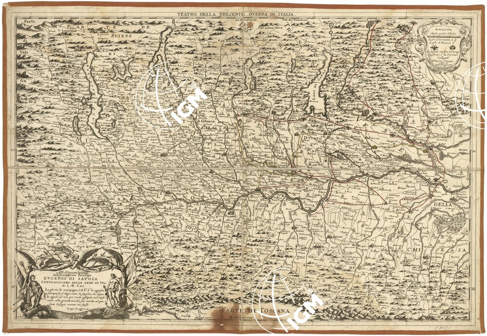 La carta si riferisce alla guerra di successione spagnola. A destra in alto trovasi descritto “IN BOLOGNA” e quindi “L’AQUILA MOSTRA LI CAMPI CESAREI E LA CORONA I COLLEGATI DELLA PRIMA CAMPAGNA 1701 A TUTTO MAGGIO 1702”. In basso a sinistra è la dedica al Principe Eugenio di Savoia; manca la firma. Nell’estremo angolo, pure a sinistra, si trovano le lettere D. B. F. La carta abbraccia il territorio compreso fra Torino, Trento, Rovigo, Genova e porta segnate le varie dislocazioni delle truppe con segni (aquila e corona) e colori.