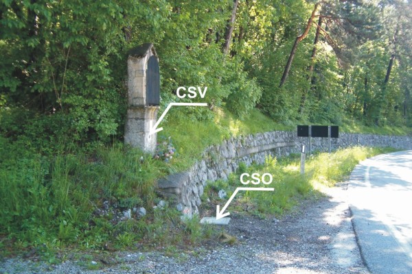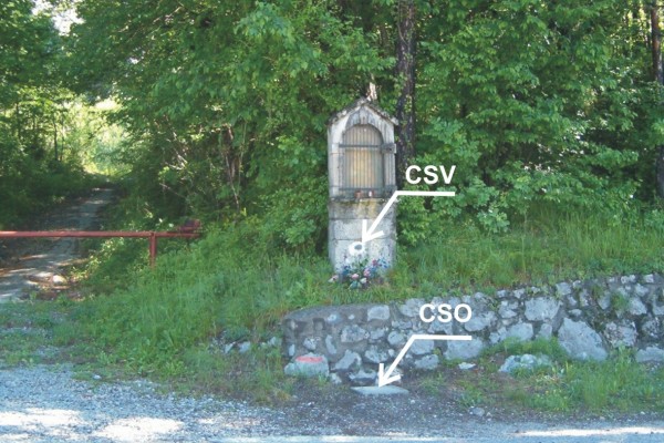 [{"simbolo_contrassegno":"P3","materializzazione":"(CSO) – Chiusino in ghisa di III Categoria rialzato con chiusino in cemento posto alla base del muro di sostegno antistante il tabernacolo."},{"simbolo_contrassegno":"V4","materializzazione":"(CSV) – Piastrina del Genio Civile infissa alla base del tabernacolo."}]