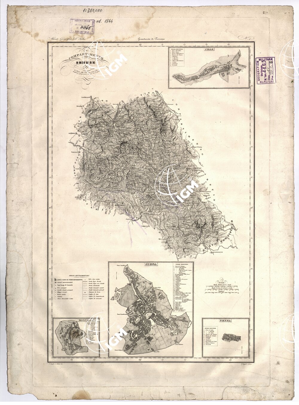 Fuori margine sono presenti le scritte ” Atlante geografico dell’Italia – Granducato di Toscana – n. 4. La tavola è stata tratta da incisione su rame eseguita da V. Stanghi, G. Maina, e disegnate da V. Angeli. L’orografia è dimostrata mediante fine tratteggio a luce obliqua. Gli abitati sono distinti in base alla loro importanza amministrativa: le strade sono classificate in regie postali e non postali, provinciali, comunali rotabili e non rotabili, con indicazioni delle stazioni di posta. Sono tracciati i confini di stato e quelli amministrativi. Sono rappresentate, all’interno della cornice della tavola, quattro piante di città alla scala di 1:12.500: Colle Val d’Elsa, Montalcino, Pienza, Siena, con elenco numerico dei luoghi principali.