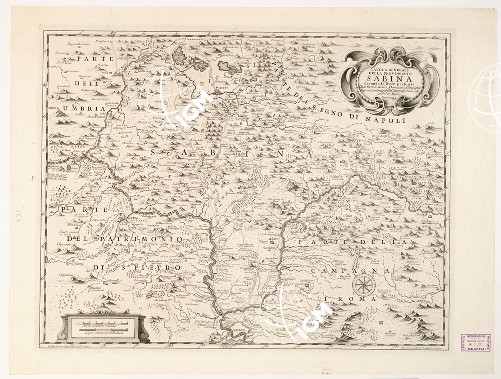 Foglio unico, inciso su rame da G. Petroschi in Roma su disegno di G. Cesare Cigni Anconitano. Orografia prospettica a monticelli. Abitati rappresentati con torri e case eccetto Roma che è in pianta. Sono tracciate le strade e indicati i boschi. La carta reca inoltre i nomi dei proprietari di castelli, tenute, ecc. E’ orientata col nord spostato a destra. Due scale grafiche in miglia comuni d’Italia e in leghe comuni di Francia. Due copie.