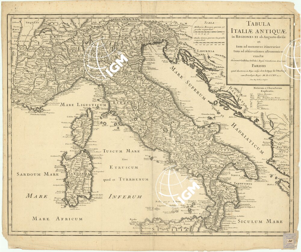 …AB AUGUSTO DIVISAE ET TUM AD MENSURAS ITINERARIAS TUM AD OBSERVATIONES ASTRONOMICAS EXACTAE. ACCURANTE GUILLELMO DEL’ISLE E’ REGIA SCIENTIARUM ACCADEMIA PARISIIS APUD AUCTOREM IN RIPA VULGO DIETA LE QUAY DE L’HORLOGE CUM PRIVILEGIO REGIS.