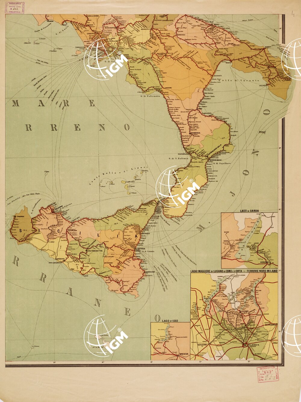 Rappresentazione orografica planimetrica. Nel foglio n. 2 sono presenti il titolo ed i segni convenzionali. Nel foglio n. 3 vi sono anche le carte: “Ferrovie dello Stato, Direzioni Compartimentali”, “Principali comunicazioni ferroviarie fra l’Italia e gli Stati d’Europa”, “Napoli strade ferrate diverse e tramvie a vapore”. Nel foglio n. 4 vi sono anche le carte: “Lago di Garda”, “Laghi Maggiore di Lugano di Como e d’Orta, Ferrovie nord Milano”, “Lago d’Iseo”. Stabilimento Geografico, Sauer & Barigazzi, Editori, Bologna.