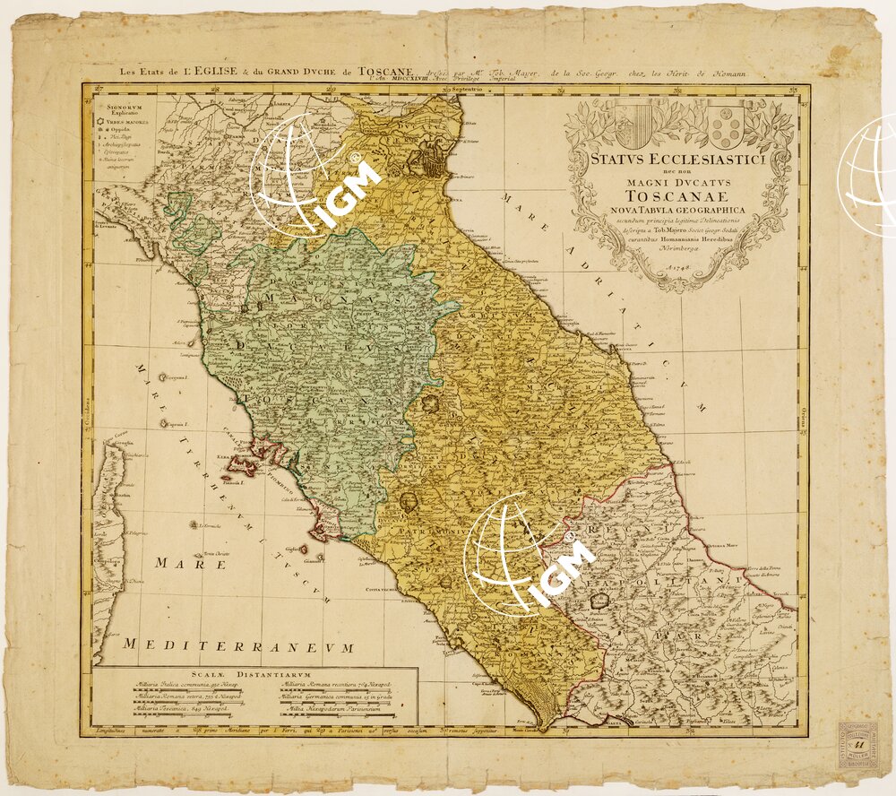 STATUS ECCLESIASTICI NEC NON MAGNI DUCATUS TOSCANAE NOVA TABULA GEOGRAPHICA SECUNDUM PRINCIPIA LEGITIMAE DELINEATIONIS DESCRIPTA A TOB. MAJERO, SOCIET. GEOGR. SODALI CURANTIBUS HOMANNIANIS HEREDIBUS NORIMBERGAE A. 1748