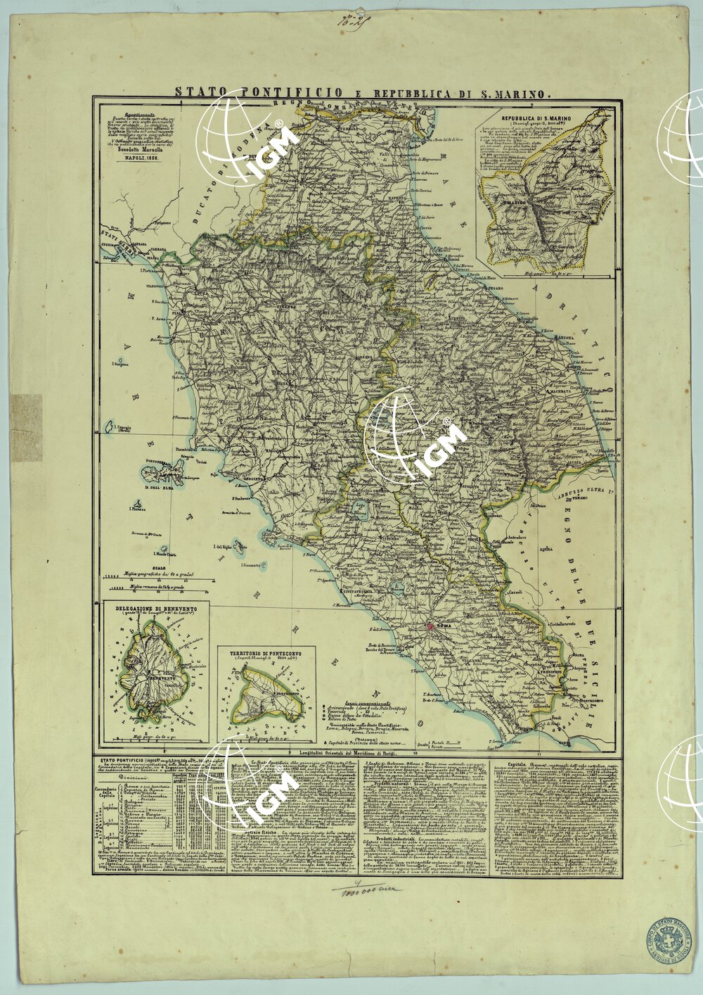 Un foglio in litografia facente parte dell’Atlante Geografico-Statistico pubblicato in Napoli da Benedetto Marzolla. Una nota in alto, avverte che la carta è fondata sui più recenti e i più esatti documenti allora esistenti, con note statistiche tratte da fonti ufficiali. Essa rappresenta il territorio compreso tra Ferrara. Gaeta, e i due mari Tirreno ed Adriatico, con orografia a tatteggio e confini politici a colori. In alto a destra una cartina supplementare per la Repubblica di S. Marino; in basso a sinistra due cartine per la delegazione di Benevento e il territorio di Pontecorvo. In basso note geografico statistiche.