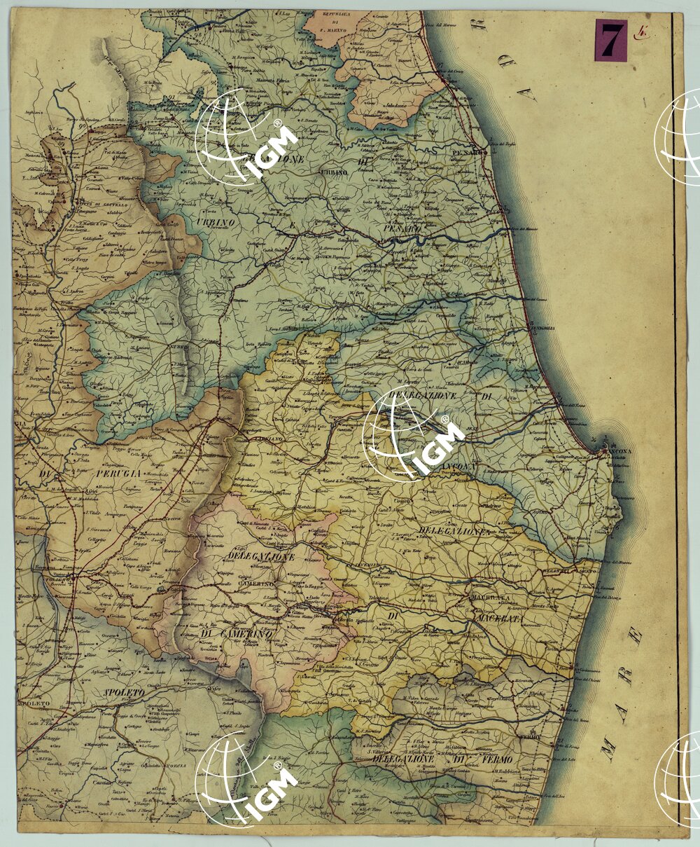 Tre fogli incisi su rame da Aless. Moschetti su disegno di Gaetano Spinelli. Essi rappresentano rispettivamente: 1) il territorio compreso tra i confini del Granducato di Toscana, Civitavecchia e Ripatransone; 2) da Civitavecchia a Terracina ai confini col Regno di Napoli; 3) dai confini con la Toscana, Ducato di Modena e Regno Lombardo-Veneto all’Adriatico. Orografia a tratteggio a luce zenitale. Il foglio N° 1 contiene la leggenda dei segni convenzionali; il foglio N° 2 reca un indice delle strade legali di comunicazione tra le dogane pontificie e quelle estere con indicazione delle distanze calcolate in miglia e dei porti e degli scali legali; il foglio N° 3 contiene il titolo. Scala grafica in miglia romane. La copia d’Arch. è in 6 fogli (dei quali mancante quello che comprende il Lazio) montati su tela. Non rappresenta l’orografia: i territori amministrativi sono distinti a colori; le strade postali sono in nero: le provinciali e comunali in rosso e in giallo rispettivamente. Le acque sono in azzurro. I centri abitati in rosso. Il foglio I contiene il titolo; il foglio III la leggenda dei segni convenzionali; il foglio VI l’indice delle strade legali di comunicazione fra le dogane pontificie, e le dogane estere colla distanza distinta in miglia, ecc., ecc.