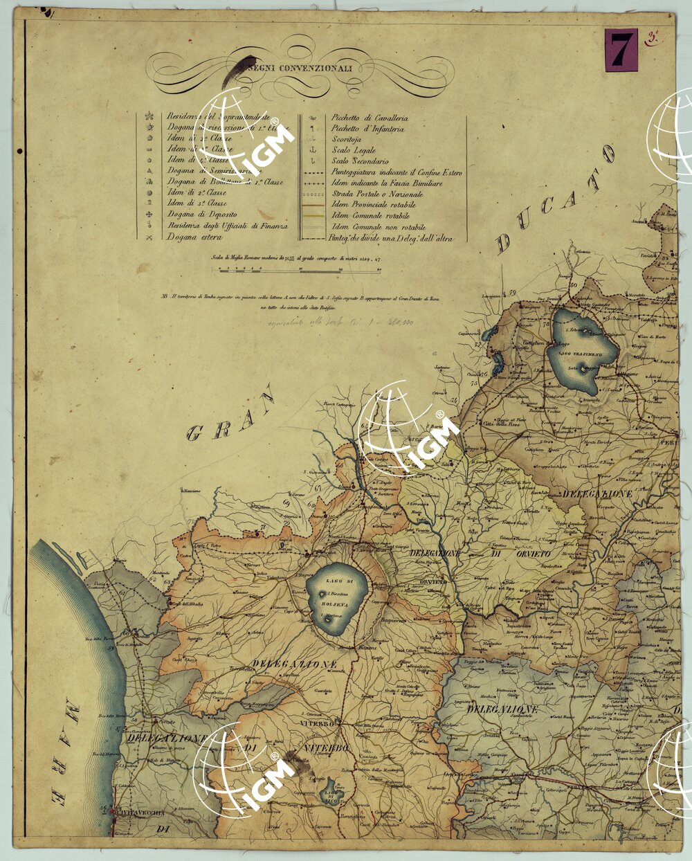 CARTA COROGRAFICA DELLO STATO PONTIFICIO INDICANTE LE DOGANE I POSTI ARMATI DALLA TRUPPA DI FINANZA, LE STRADE DOGANALI, LA FASCIA BIMILIARE DI DIVIETO E LE DOGANE ESTERE CHE CORRISPONDONO ALLE PONTIFICIE.